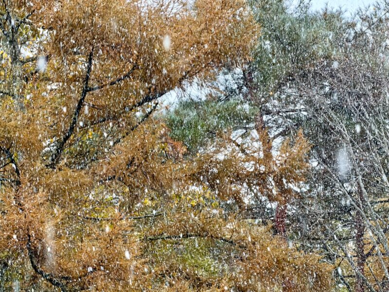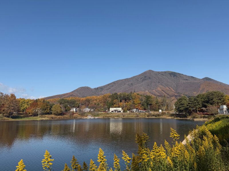 先日の雪化粧の飯縄山から本日7日は小春日和となり、大座法師池周辺ではカエデなどの赤い紅葉の他にカラマツもいよいよ黄金色に黄葉しはじめ色とりどりの景色を楽しめています。