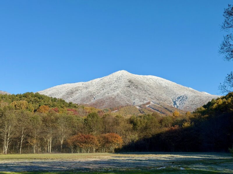 連休最終日は夜中からの冷たい雨から、途中みぞれ混じりの雪が降ったりと寒い1日でしたが、開けて4日は綺麗な青空が広がり真っ白となった飯縄山が見られました。
