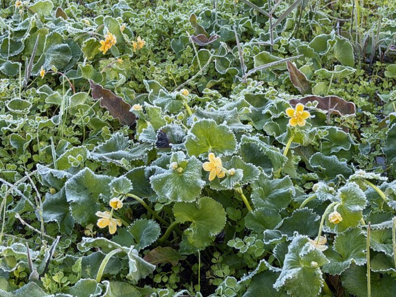 春に黄色の花を咲かせるリュウキンカですが、今年はいつもの年より返り咲きの花が多いような気がします。