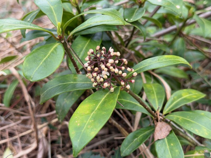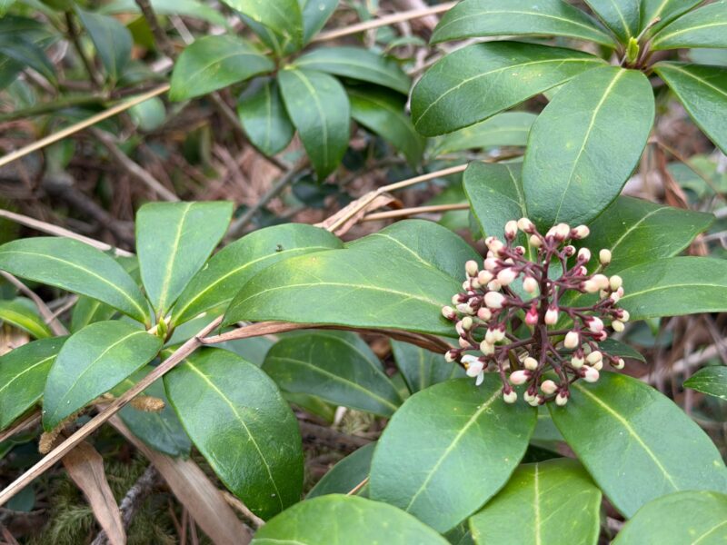 あまり見かけたことがなかったのですが、ミヤマシキミ?木の根元にひっそりとつぼみをつけていました。