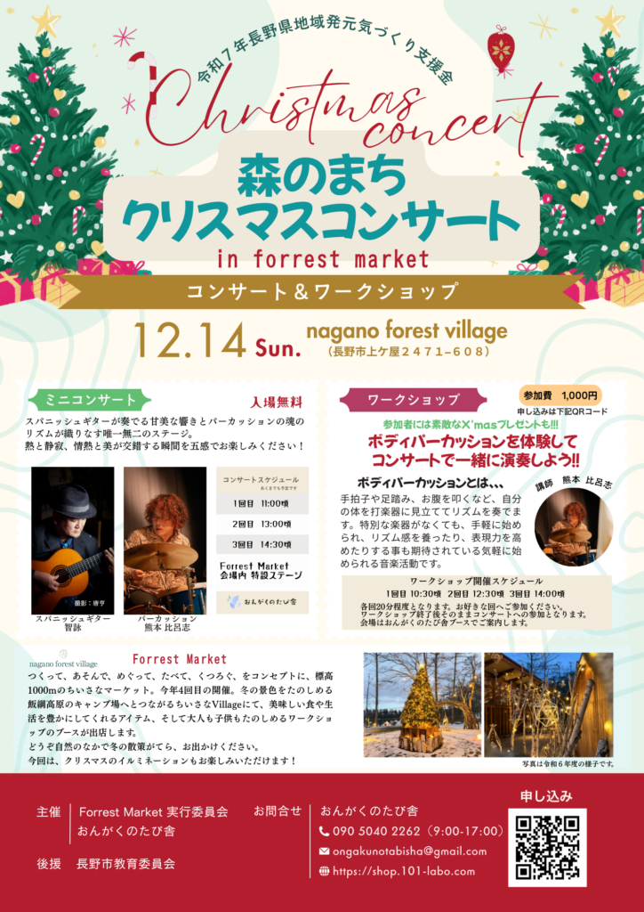 12月14日(日)nagano forest village(森の駅Daizahoushi)にて、おんがくのたび舎様による『森のまちクリスマスコンサート』が開催されます。