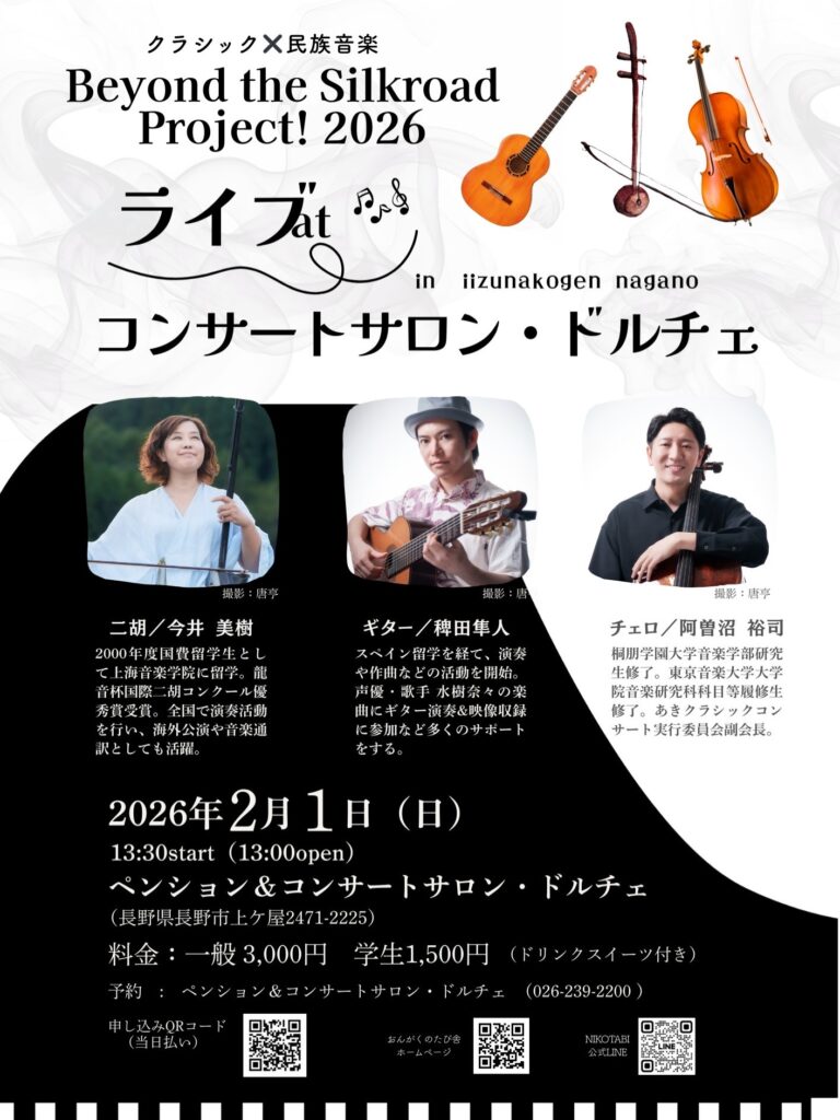 2026年2月1日(日)ペンションドルチェ様の音楽ホールにて、二胡の今井美樹さん、ギター稗田隼人さん、チェロ阿曽沼裕司さんをお迎えして、クラシック×民族音のコンサートが開催されます。